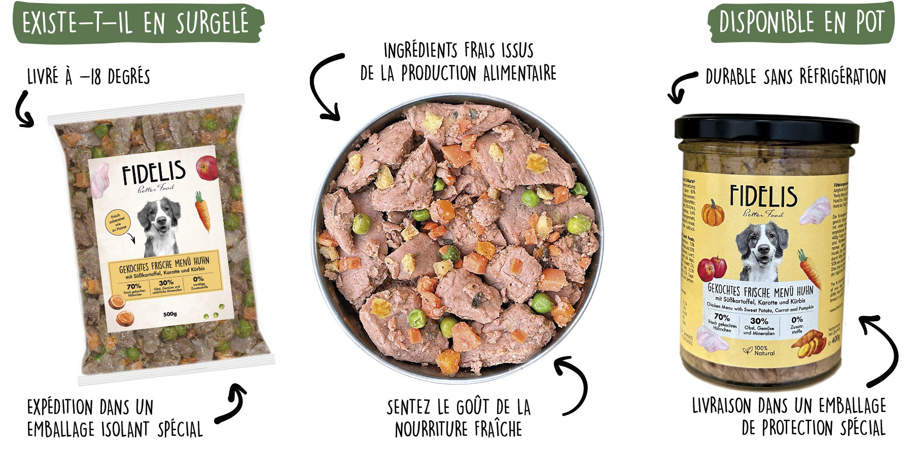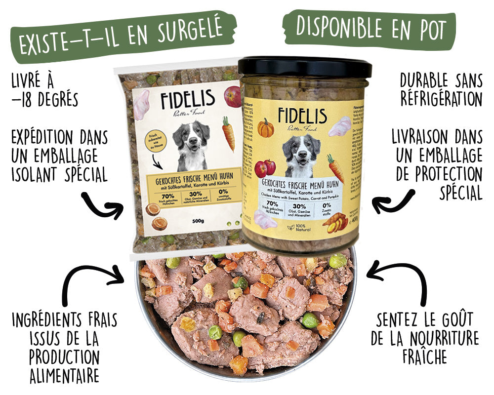 Claudia cuisinait autrefois elle-même pour Wotan. Les croquettes et la pâtée en boîte lui semblaient trop mauvaises, et Wotan ne supportait pas le BARF. Les menus frais FIDELIS sont aussi appétissants que la nourriture faite maison de Claudia. Côté prix, ils sont à peu près équivalents – mais si l’on ajoute le temps pour faire les courses et cuisiner, les menus frais FIDELIS sont nettement plus avantageux que de cuisiner soi-même.
