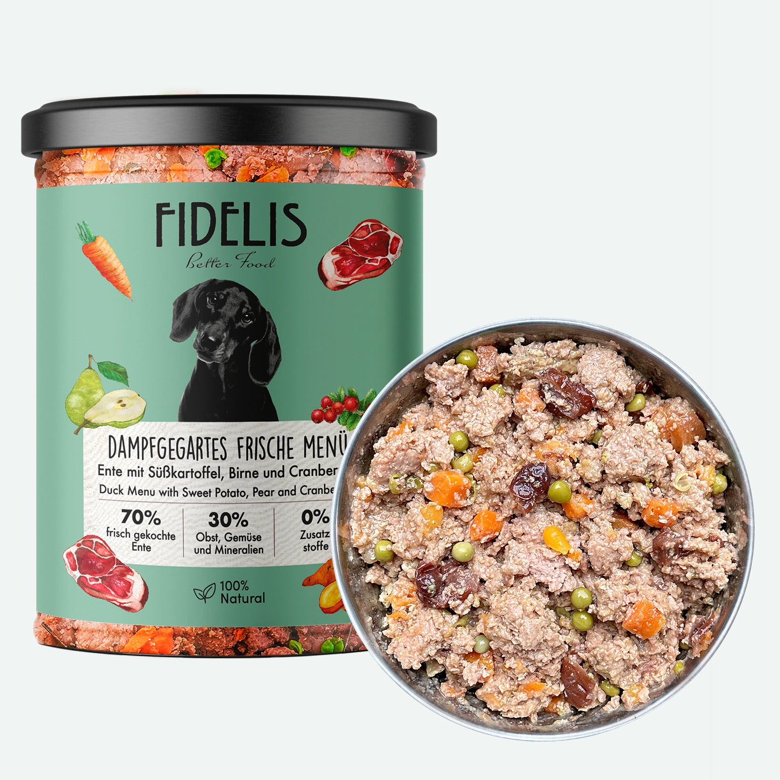 Ce qui rend nos menus frais en pot spéciaux, c'est que nous cuisons doucement la viande à la vapeur à l'extérieur du pot. Ensuite, nous ajoutons les autres ingrédients sains tels que des légumes et des fruits frais, ainsi que des huiles de qualité, et stérilisons le mélange dans le pot avec des temps de séjour nettement plus courts. Cela préserve beaucoup mieux les nutriments que, par exemple, les aliments en conserve, qui sont toujours entièrement cuits dans la boîte. De plus, la viande reste en morceaux et ne se transforme pas en une bouillie.
